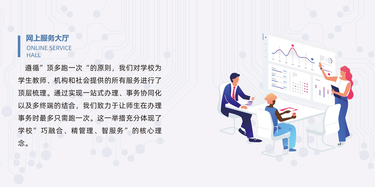遵循”頂多跑一次“的原則,我們對學校為學生教師、機構和社會提供的所有服務進行了頂層梳理。通過實現一站式辦理、事務協同化以及多終端的結合,我們致力于讓師生在辦理事務時最多只需跑一次。這一舉措充分體現了學校”巧融合、精管理、智服務”的核心理念。