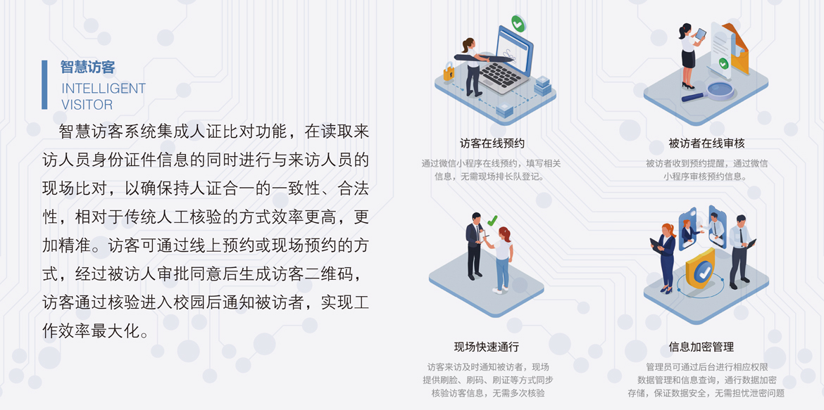 智慧訪客系統集成人證比對功能,在讀取來訪人員身份證件信息的同時進行與來訪人員的現場比對,以確保持人證合一的一致性、合法性,相對于傳統人工核驗的方式效率更高,更加精準。訪客可通過線上預約或現場預約的方式,經過被訪人審批同意后生成訪客二維碼,訪客通過核驗進入校園后通知被訪者,實現工作效率最大化。