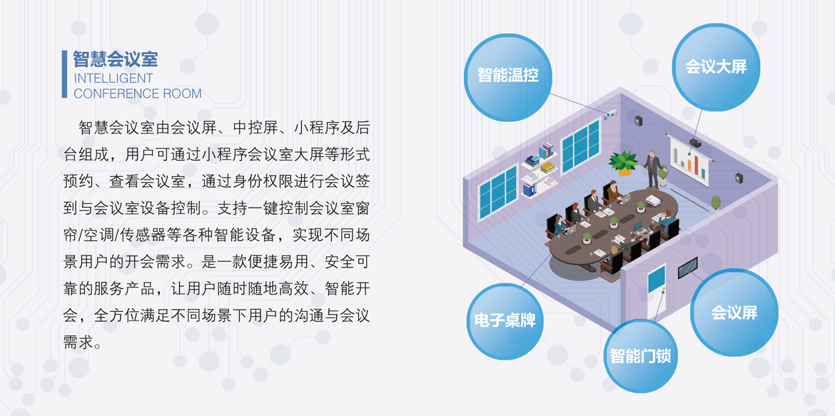 智慧會議室由會議屏、中控屏、小程序及后臺組成,用戶可通過小程序會議室大屏等形式預約、查看會議室,通過身份權限進行會議簽到與會議室設備控制。